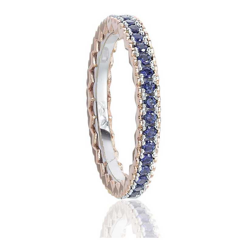 Anello eternity in oro 18 carati con dettaglio di cuori laterali. Pietre preziose da 1,50 mm a scelta tra: rubini, zaffiri blu, smeraldi o diamanti neri.