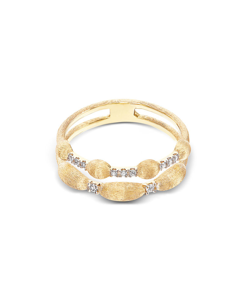 Diamanti e oro giallo 18 kt si rincorrono in questo sofisticato anello, avvolgendo teneramente il dito e facendolo brillare.