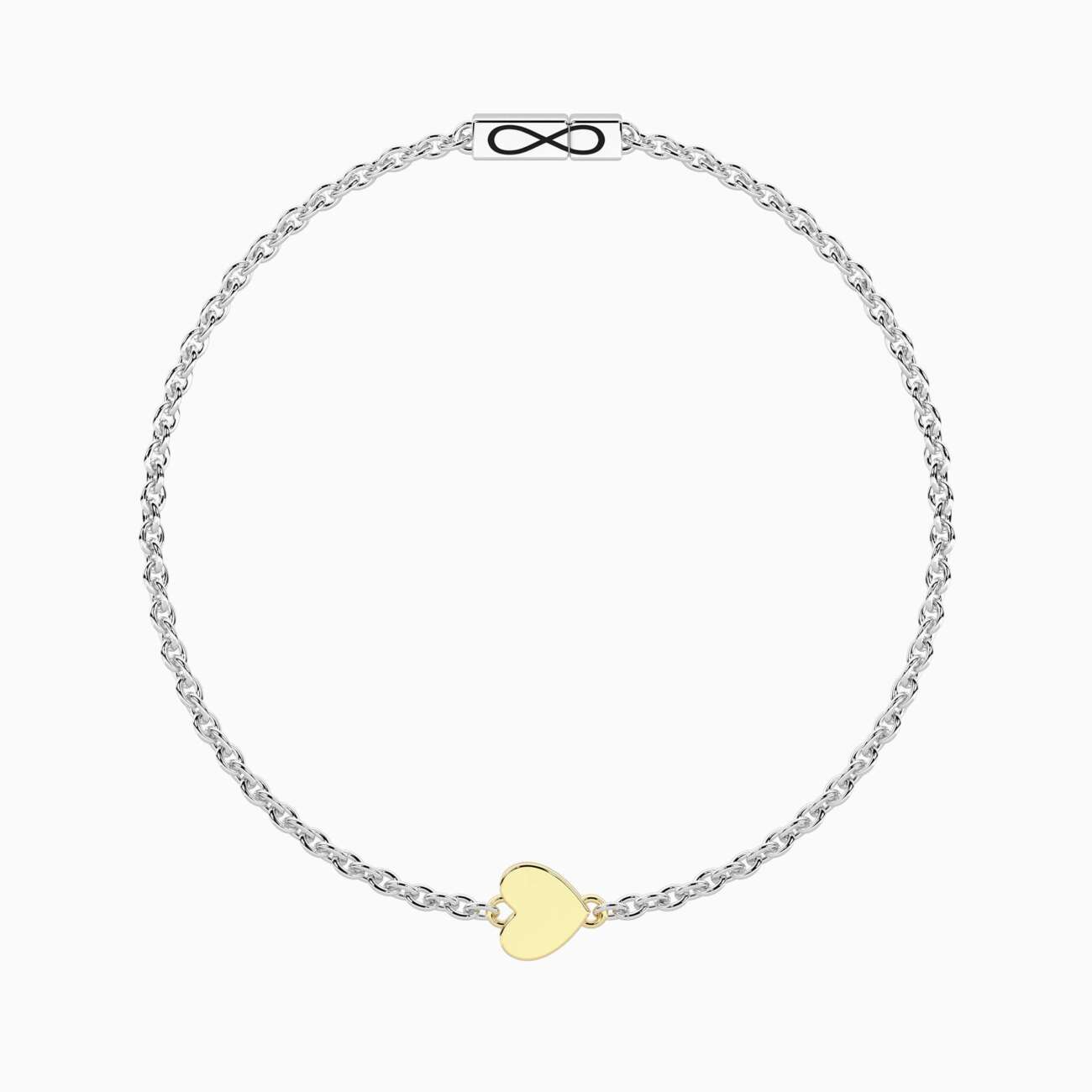 Bracciale unisex con catena forzatina in acciaio taglia 16. Simbolo cuore in oro 9kt e chiusura non-reversibile con simbolo dell’infinito.
