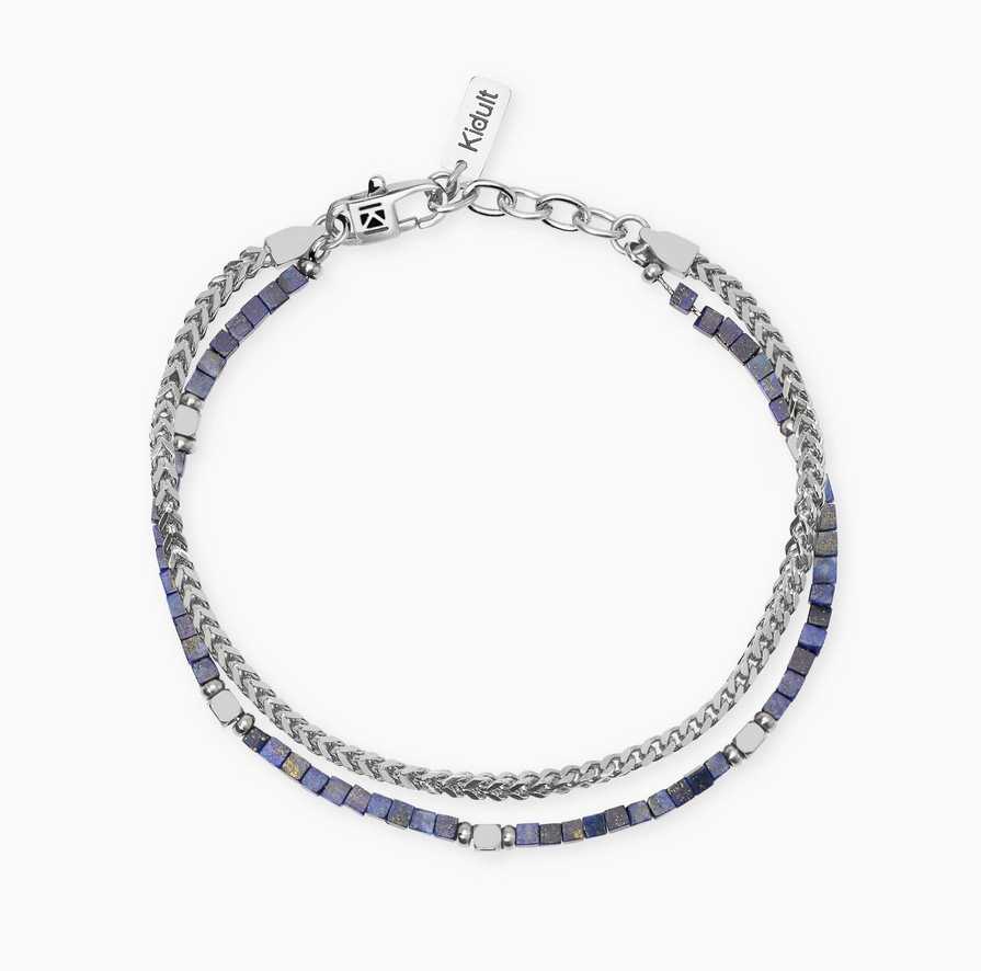 Bracciale regolabile con catena franco in acciaio e cubettii faccettati lucidi e in sodalite blu stirata.