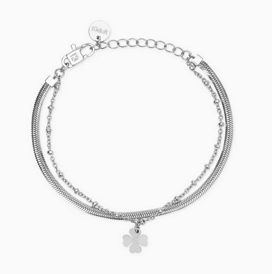 Bracciale regolabile in acciaio con catene rolò e snake, e ciondolo quadrifoglio.