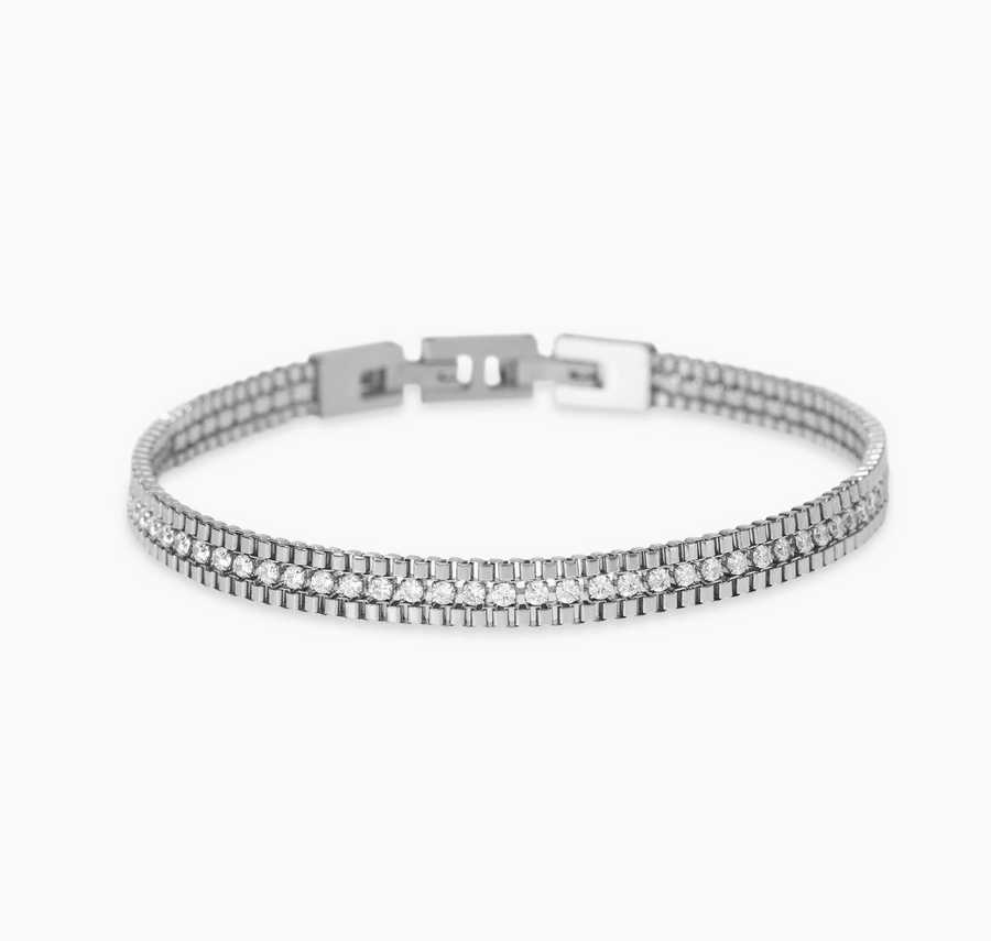 Bracciale regolabile con catene venete in acciaio e catena tennis di cristalli bianchi.