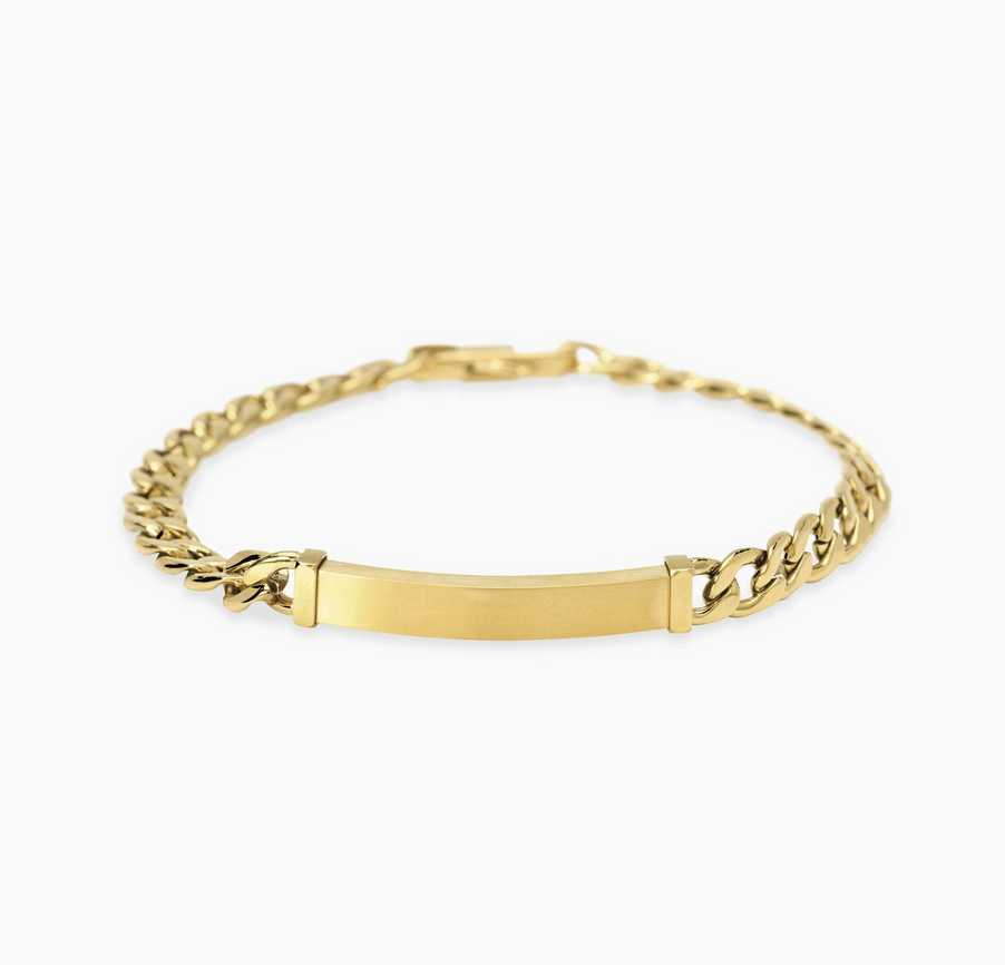 Bracciale in acciaio dorato con catena groumette e piastra centrale satinata.