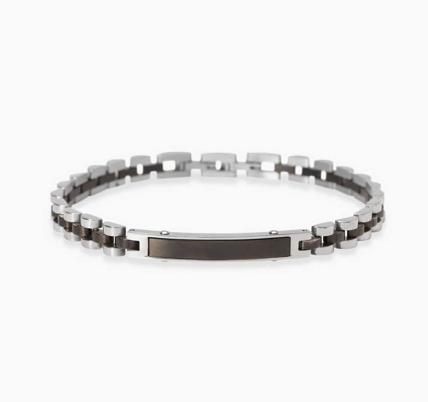 Bracciale regolabile in acciaio lucido e satinato con elementi imperniati in gunmetal e piastra centrale neri.