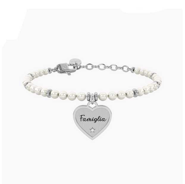 Bracciale da donna regolabile in acciaio lucido e satinato con perle conchiglia e ciondolo a forma di cuore con cristallo e scritta “Famiglia”.