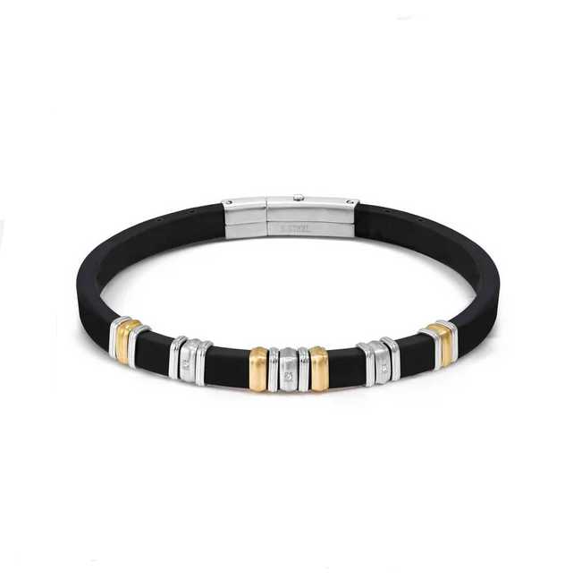 Bracciale da uomo Nomination della collezione City, edizione Energy, realizzato in caucciù nero con elementi in acciaio inossidabile argentato e nero e tre pietre di zirconia cubica bianca. Chiusura magnetica.