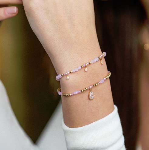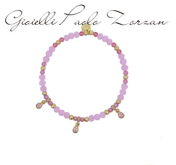 Bracciale elastico con filo di palline d’argento alternate a zirconi rosa a pietre miste rosa e tripla goccia pendente. Pavè di zirconi total pink.