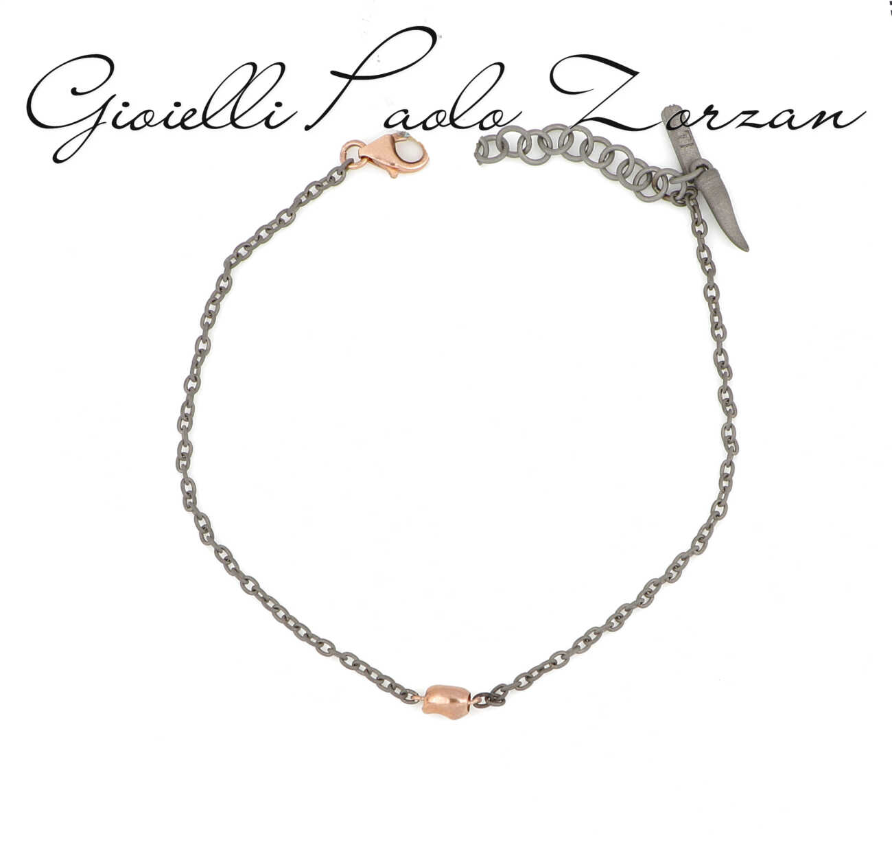 Bracciale da uomo in titanio e oro rosso 9 kt. Lo sviluppo del bracciale prende forma dall’elemento principale: una pepita in oro rosso 9 kt . Ai vertici del cornetto, due piccoli anellini fanno da supporto alla catenina che termina con un piccolo cornetto pendente in titanio. Il bracciale è regolabile da 18 a 21 cm per permettere il massimo confort e vestibilità. A garanzia del marchio MANO, sulla piccola targhetta vicino al moschettone, fa la sua comparsa il diamante black da 1 punto, simbolo inconfondibile del brand.
