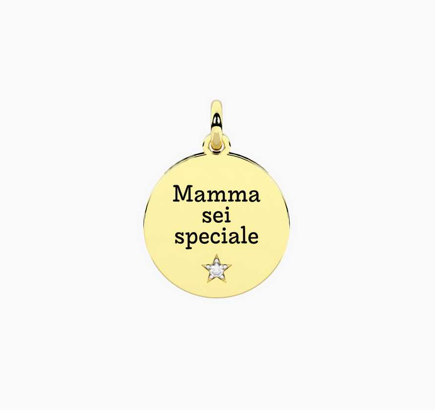 Ciondolo in acciaio dorato satinato con scritta “Mamma sei speciale” e sul retro “Perché non hai smesso di credere nella tua famiglia” e cristallo.