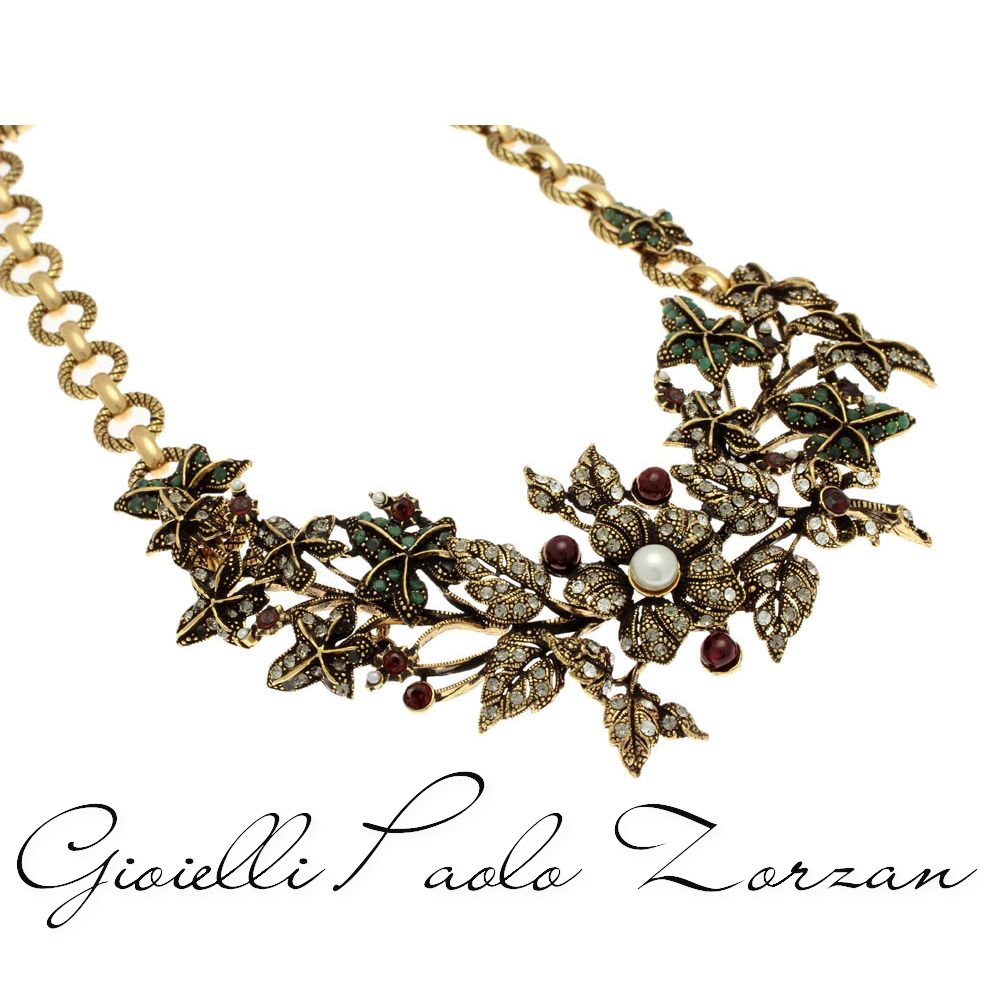 La Collana Edera in ottone dorato, creata interamente a mano con tecniche artigianali raggiunge a pieno l’emblema della tradizione gioielliera e racchiude in se tutta l’eleganza di un bijoux unico. Interamente ricoperta di smeraldi, swarovski, granati e perla. Gioiello di alta bigiotteria Made in Italy.