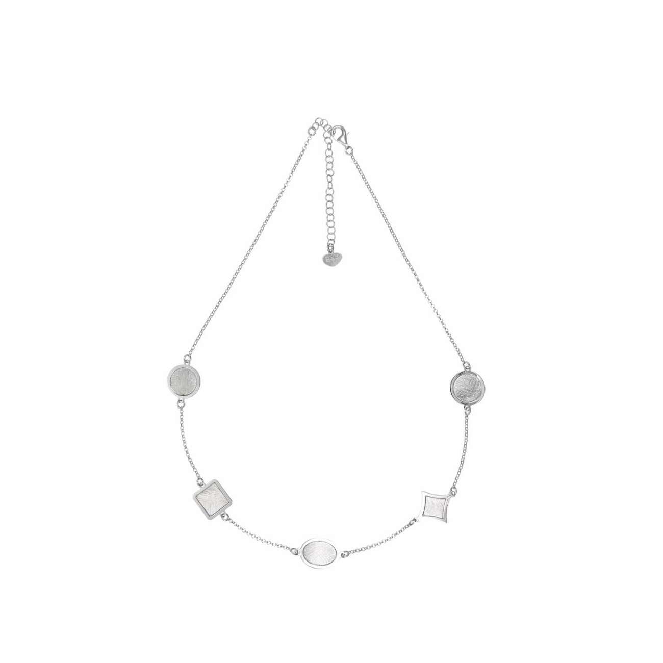 Collana in argento 925 con ciondoli a forma di rombo, quadrato, cerchio e ovale mixati tra loro. Un gioiello moderno e versatile che unisce eleganza e design contemporaneo.