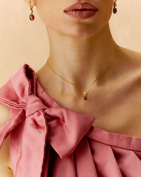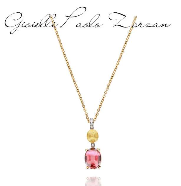 Un’eleganza romantica e senza tempo contraddistingue questo sofisticato pendente in oro 18kt e brillanti, coronato da una boule in tormalina rosa. Questa pietra, che cambia di intensità a seconda dell’angolo di osservazione, è una delle più straordinarie che la Natura ci regali e le sue caratteristiche striature interne rendono ogni gioiello unico e inimitabile.