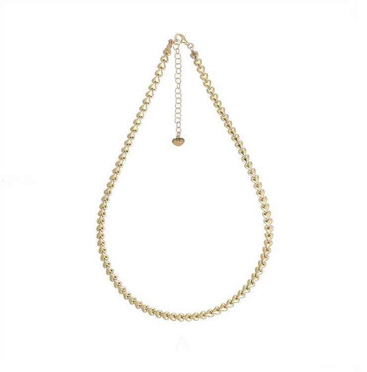 Collana in argento 925 placcato oro 23kt con cuori ripetuti lungo la catena. Un gioiello romantico e delicato, perfetto per ogni occasione.