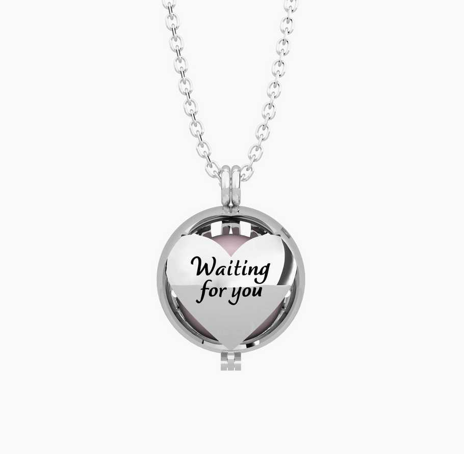Collana Chiama Angeli per gender revel con catena forzatina diamantata, sfera con cuore e scritta “Waiting for you”. Due sfere colorate dotate di campanellino, da scegliere e inserire all’interno del ciondolo per il momento del gender reveal.