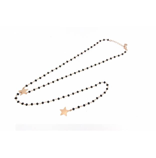 Collana Rue des Mille lunga pietre nere e filo centrale con inserto stella. Argento 925°%, galvanica oro rosa.