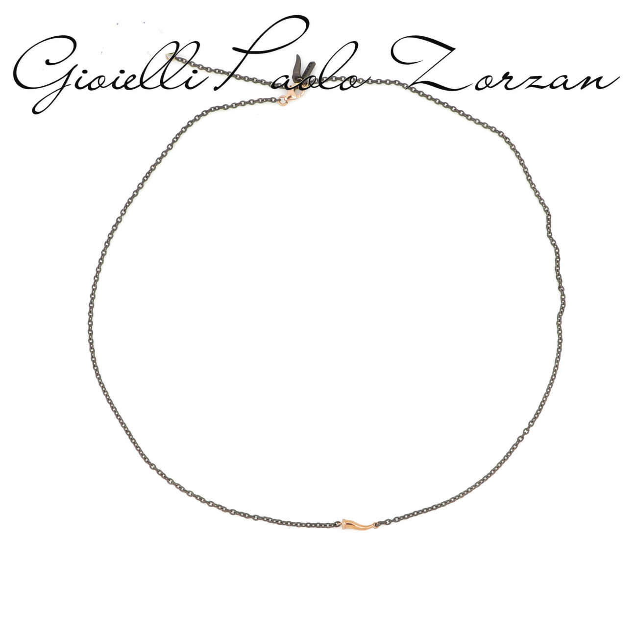 Collana da uomo in titanio. Lo sviluppo della collana prende forma dall’elemento principale: un cornetto portafortuna in ORO ROSA 9 KT . Al vertice superiore del cornetto, un piccolo anellino funge da supporto per la catena che termina con un doppio anellino permettendo così di accorciare o allungare la collana, donando massima indossabilità.A garanzia del marchio MANO|J., sulla parte posteriore del cornetto, fa la sua comparsa il diamante black da 1 punto, simbolo inconfondibile del brand.