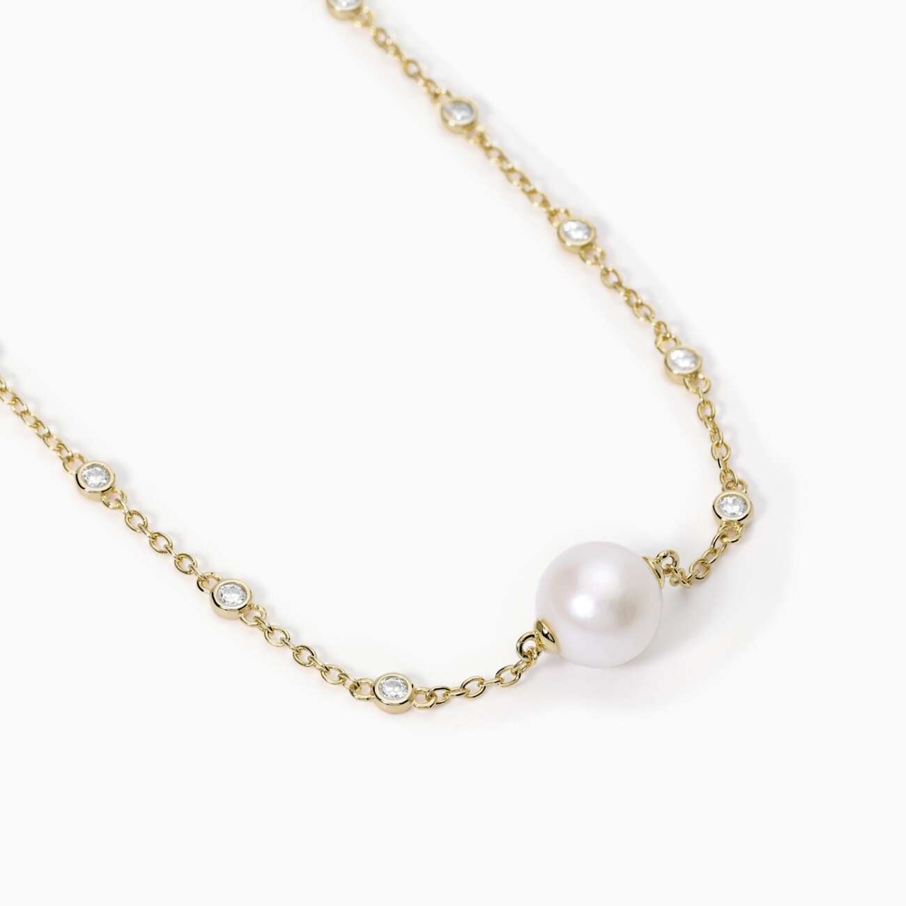 Girocollo in argento placcato oro 18k con catena forzatina, perla coltivata centrale e punti luce.