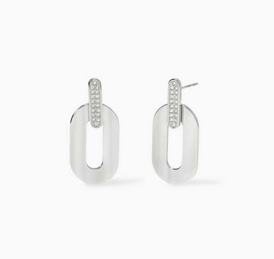Orecchini in acciaio con cristalli e pendenti allungati.