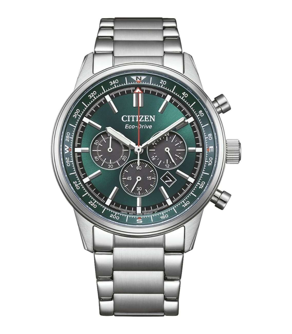 Orologio Cronografo Eco drive con cassa in acciaio di diametro 42 mm, quadrante verde e impreziosito dalla rosa dei venti, simbolo di orientamento e avventura. Cinturino in acciaio, con chiusura a pulsante. Il movimento Eco-Drive a carica solare garantisce una riserva di carica di 270 giorni.