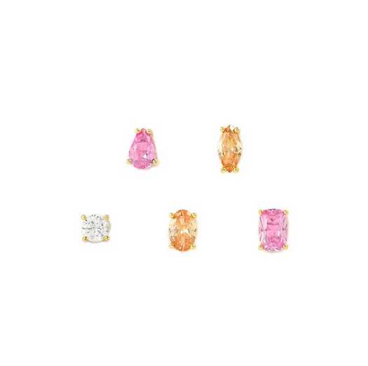 Set 5 Orecchini in Argento con rivestimento superficiale in Oro Giallo con Cubic Zirconia di diversi tagli e differenti tonalità di colore: rosa, champagne e bianco. Ogni pietra ha un taglio diverso dai colori bianco, rosa e arancione. Un’orecchino per ogni occasione! Un vero e proprio must-have: da insossare soli o con altri orecchini per un look più ricercato.